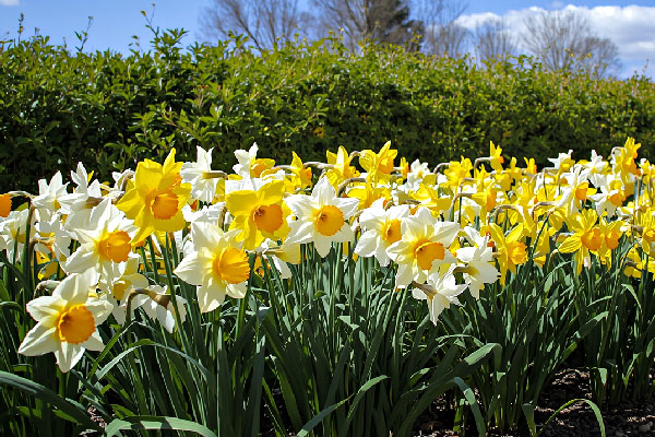 Поверхность грядок можно укрыть слоем опавшей листвы толщиной 10–15 см. Хотя это не обязательно, нарциссы способны успешно перенести зиму и без дополнительного укрытия.